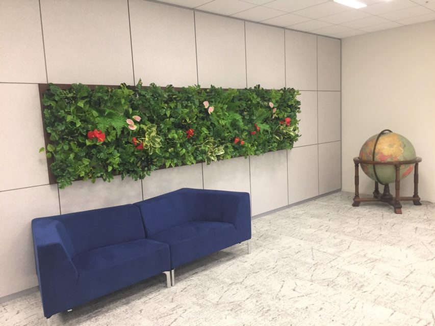 オフィスの受付が殺風景なので植物やグリーンを飾りたいとのご依頼をいただきました。ただ受付エリアの壁面には穴あけなど傷を付けないで何かできないかとのご相談もありました。下見の際に壁面の素材を確認したところ磁石が付くタイプだったためマグネット式の壁面緑化をご提案しました。
